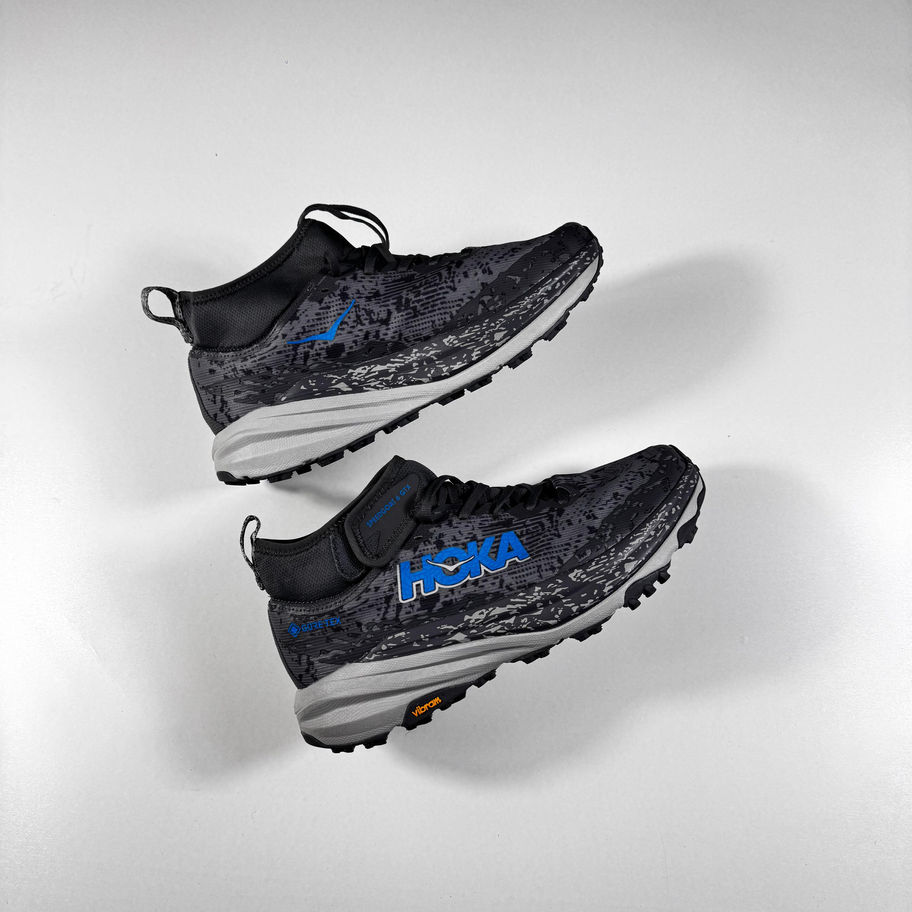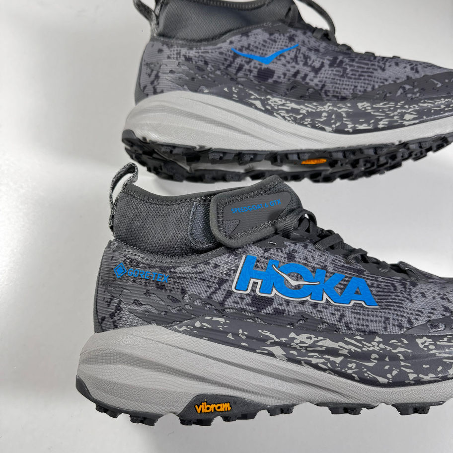HOKA Speedgoat 6 Mid GTX, a waterproof trail hiking shoe featuring a Vibram Megagrip outsole.